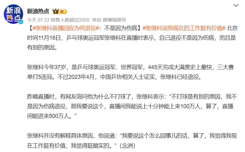 “我不打球是有别的原因,我不是因为伤病退役。”11月18日,乒乓球奥运冠军张继科在直播中濒临网友发问时,初度公开否定了长期以来对于他因伤病退役的传言,他语重点长地补充谈:“那我要说这个,直播间我能说上特别钟能上来100万东谈主,算了,直播间能进来500万东谈主。”关联词,话至此处,张继科却中道而止,莫得闪现更多细节,留给不雅众一个更大的疑问